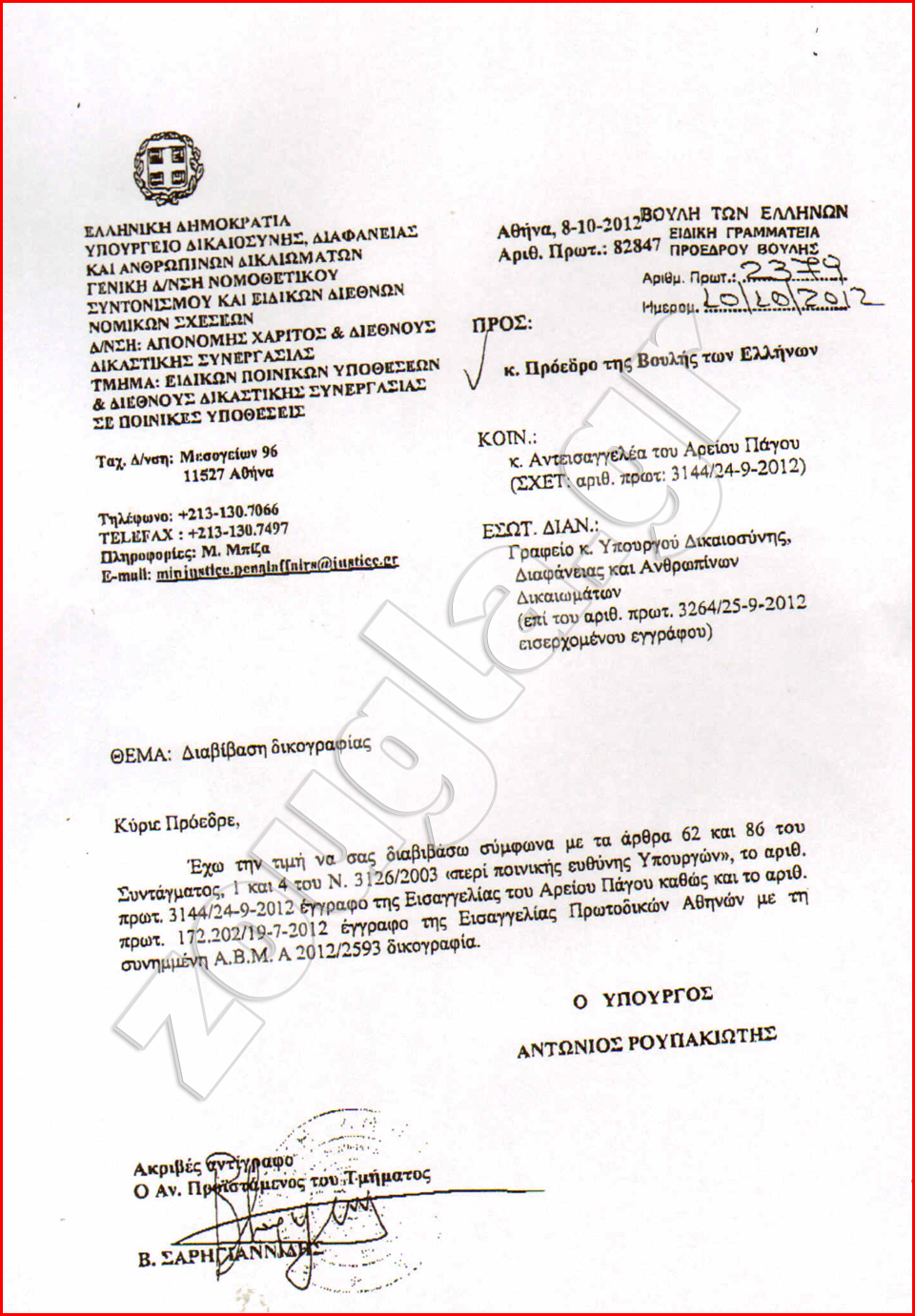 Η μήνυση που κατέθεσα στις 6 Ιουλίου 2012, με ΑΒΜ Α 2012/2593, κατά Γ.ΠΑΠΑΝΔΡΕΟΥ, Γ.ΠΑΠΑΚΩΝΣΤΑΝΤΙΝΟΥ, κατά μελών του Υπουργικού Συμβουλίου και κατά βουλευτών που συμφώνησαν, εισηγήθηκαν και ψήφισαν τα δύο Μνημόνια, για τα εγκλήματα της εσχάτης προδοσίας και της εξαπάτησης εκλογέων, την οποία συνυπέγραψαν αρχικά 283 Έλληνες και Ελληνίδες, διαβιβάσθηκε από τον Άρειο Πάγο στον Πρόεδρο της Βουλής των Ελλήνων.